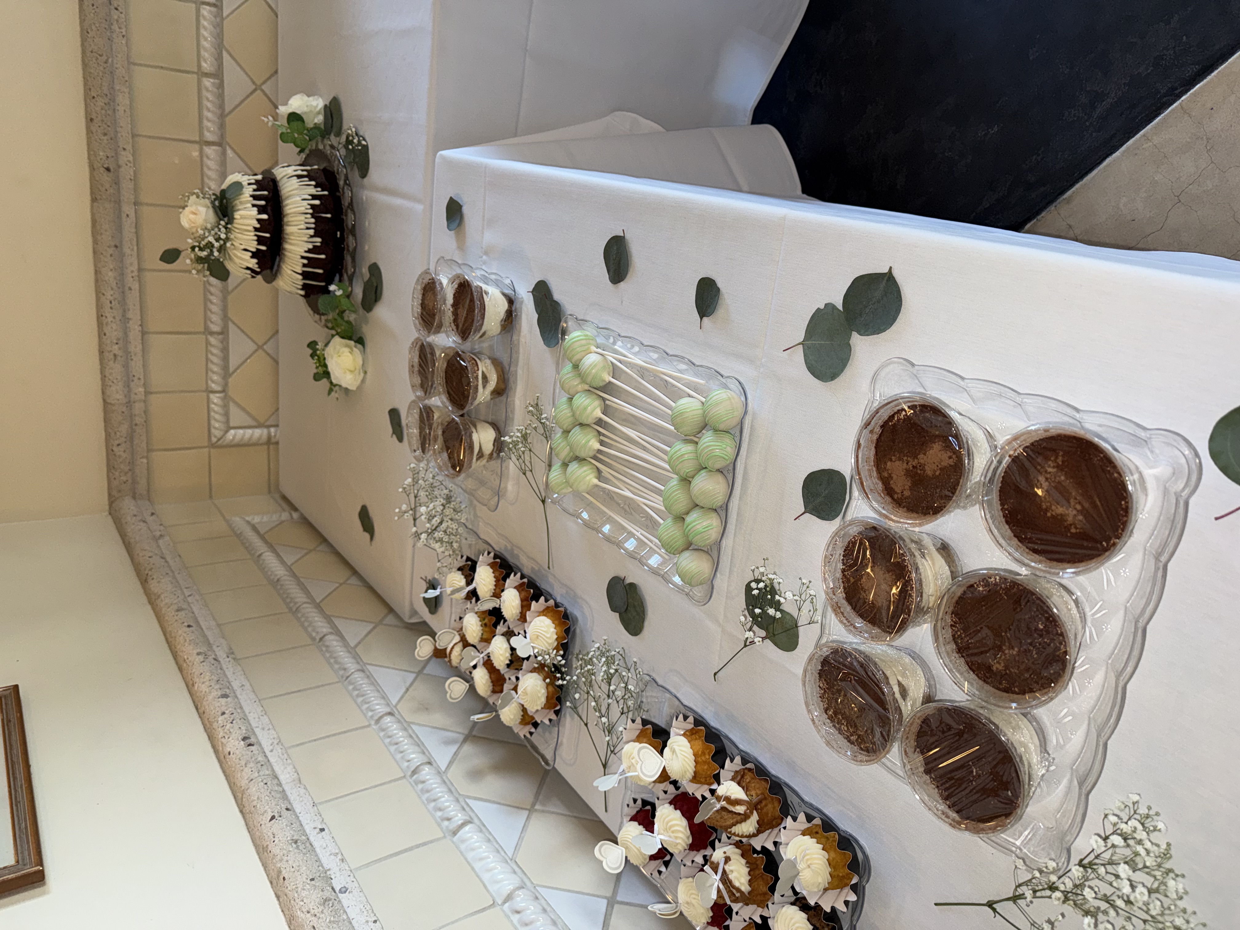 Tiramisu cups, vanilla cakepops, and chocolate cakepops. (Cake and mini cakes couple ordered from Nothing Bundt Cakes)